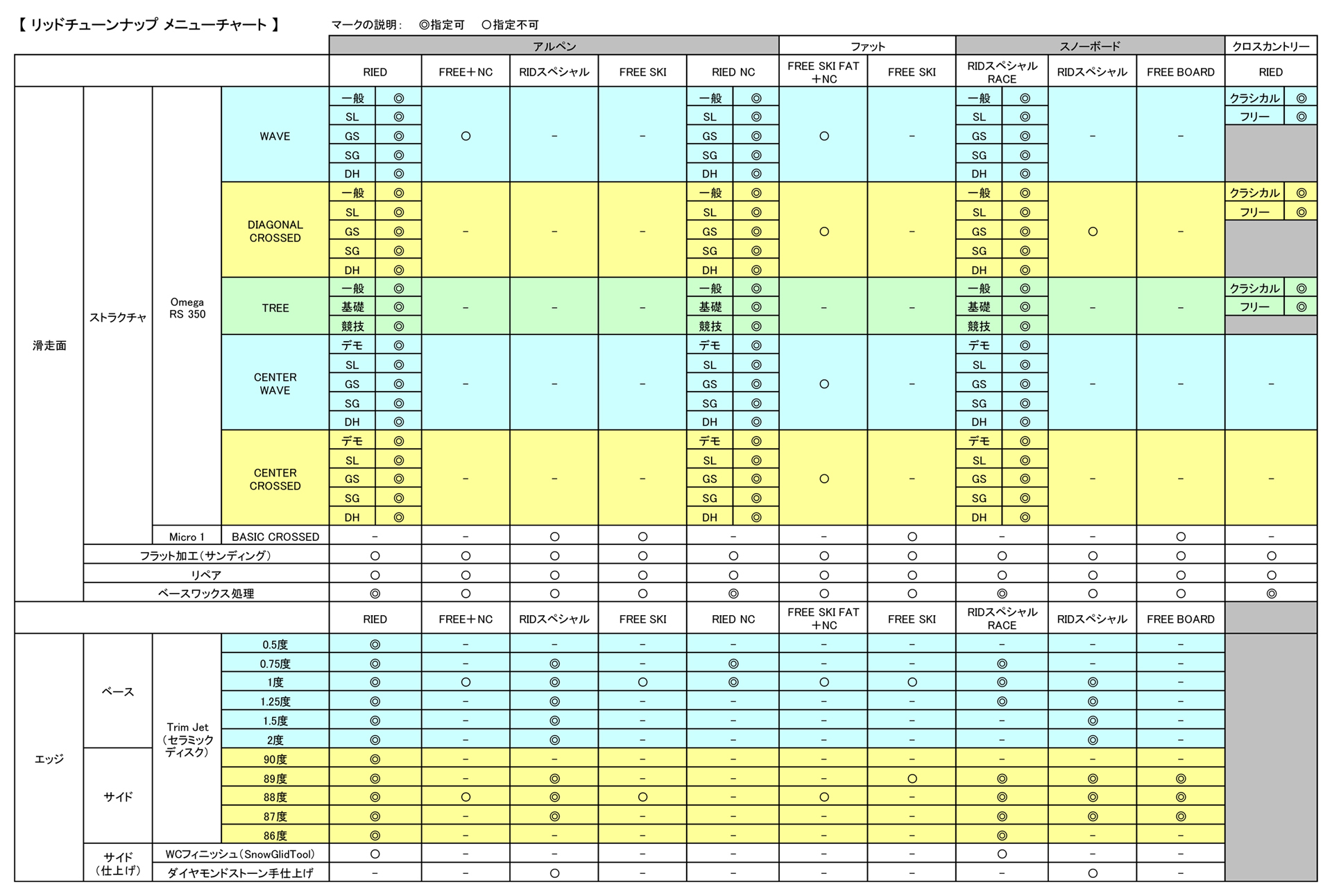 | 超滑るNC ストラクチャー(NCパターン・エッジの角度指定はできません) ●リペア&フラット加工●NCストラクチャー(パターン指定不可) ●トリムジェット(ベース:1度 サイド:88度) ●ベースワックス処理(指定不可) |
